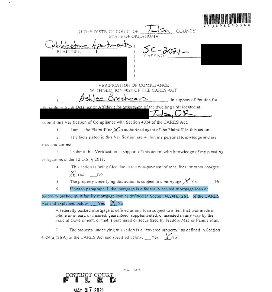 In nearly all eviction cases filed in Tulsa County, the landlord is required to file an affidavit showing compliance with the federal CARES Act, legislation passed by Congress last year to provide economic relief during the COVID-19 pandemic.
